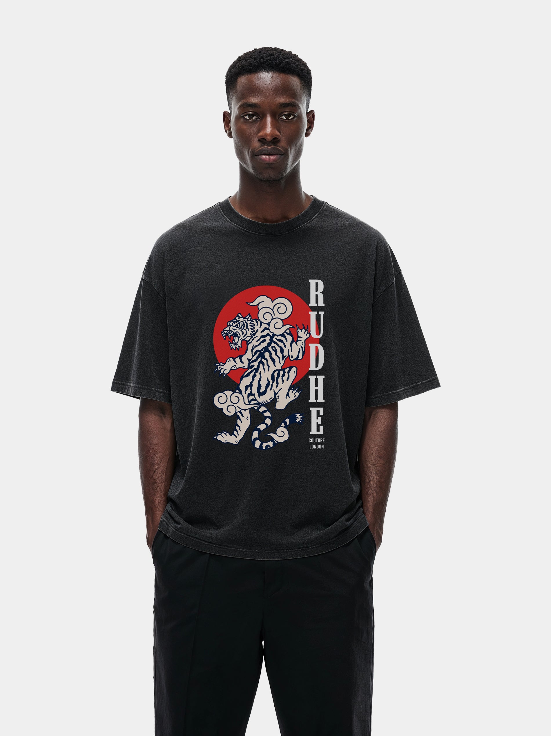 The Rudhe Couture Vintage Tiger Tee is made from core 100% cotton jersey. The rib-knit crewneck tee fits relaxed in the body with dropped shoulders.